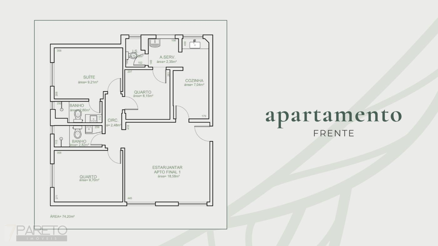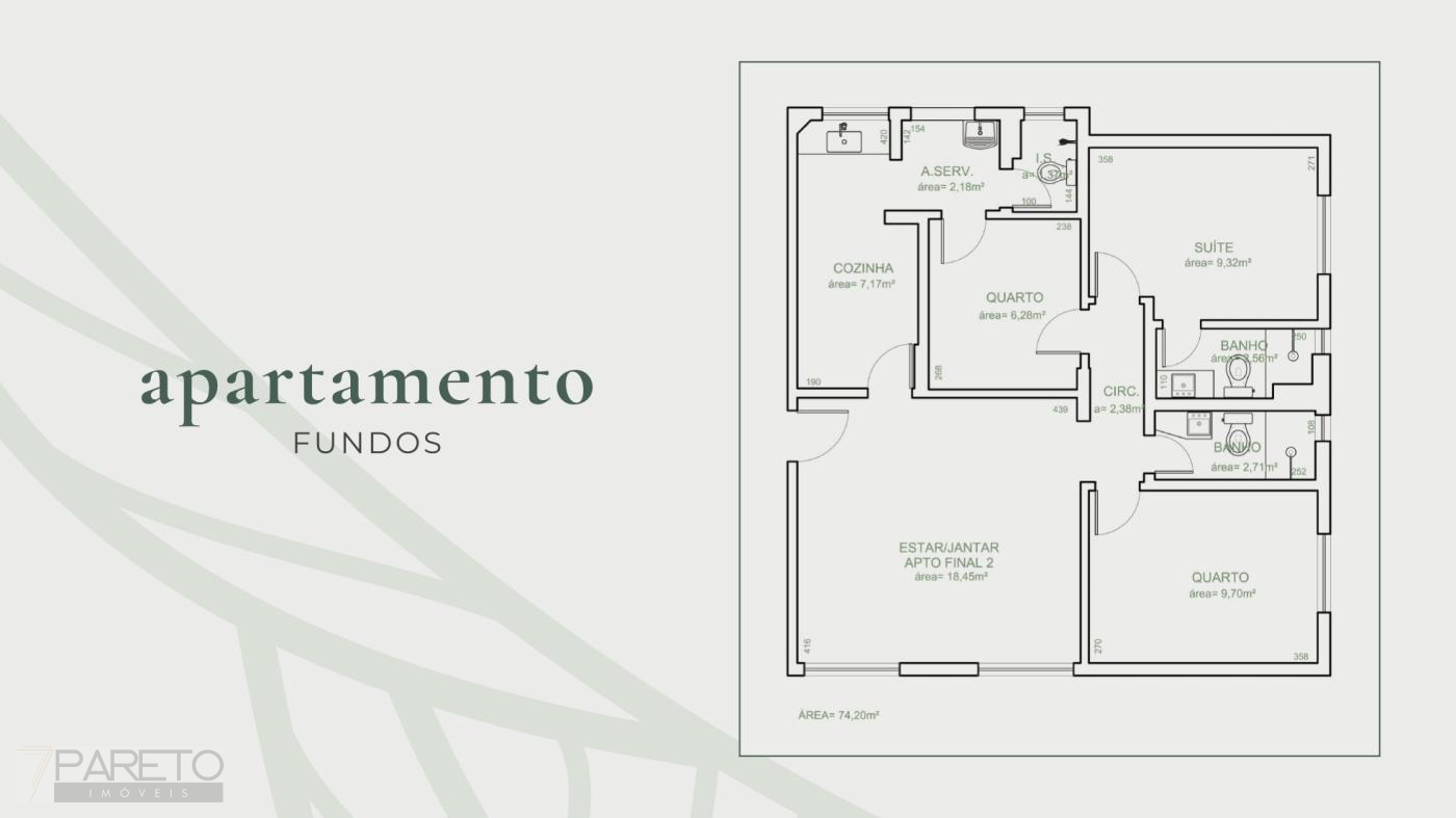 Área Total de 74,30 m, Área Privativa de 74,30 m.